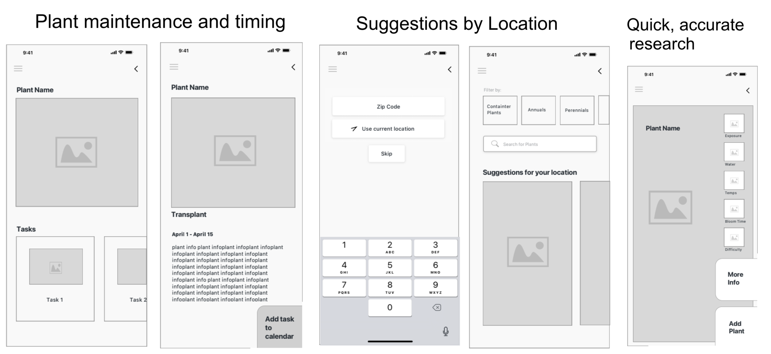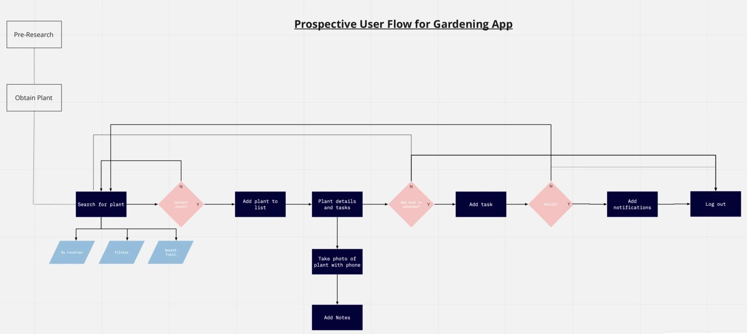 The user flow walks a person through obtaining a plant, finding it on the app, adding it to their cache of saved plants, looking at plant details and task information, and adding tasks to their calendar, with the option of being notified when the task is due. Also, the user will have the option to take a photo of the plant and add their own notes.