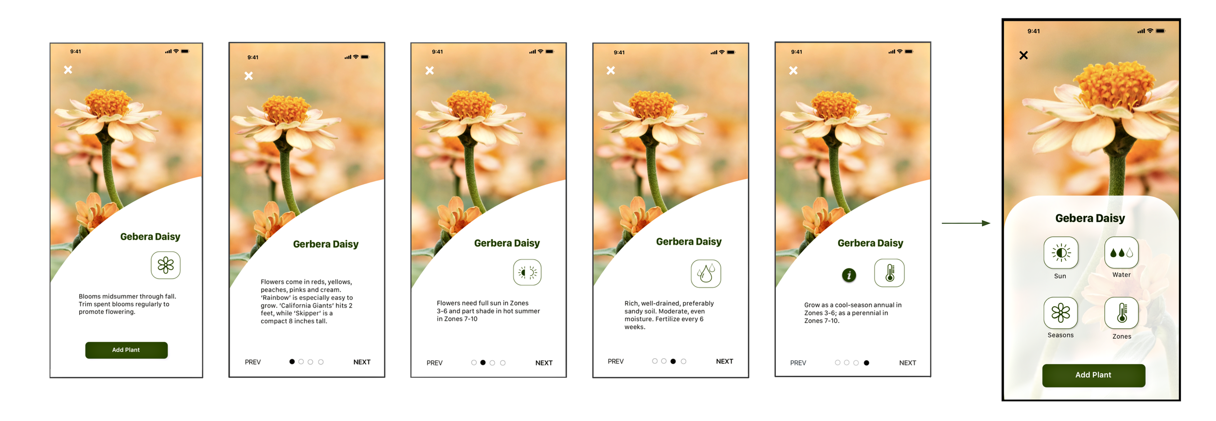 I decided to add an option to “Add Plant” on the first screen, as well as add a description of what page/information is next and add more control for the user.