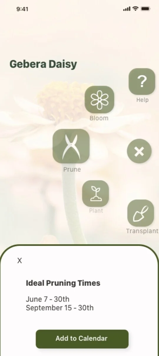 I tested the identification feature, adding the pruning task to the user’s calendar, searching for and saving a container plant as well as searching for the Help feature. The goals of the test were to discover the user’s initial impressions of plant information screens, their impressions of how detailed information is presented, and to uncover any usability problems.